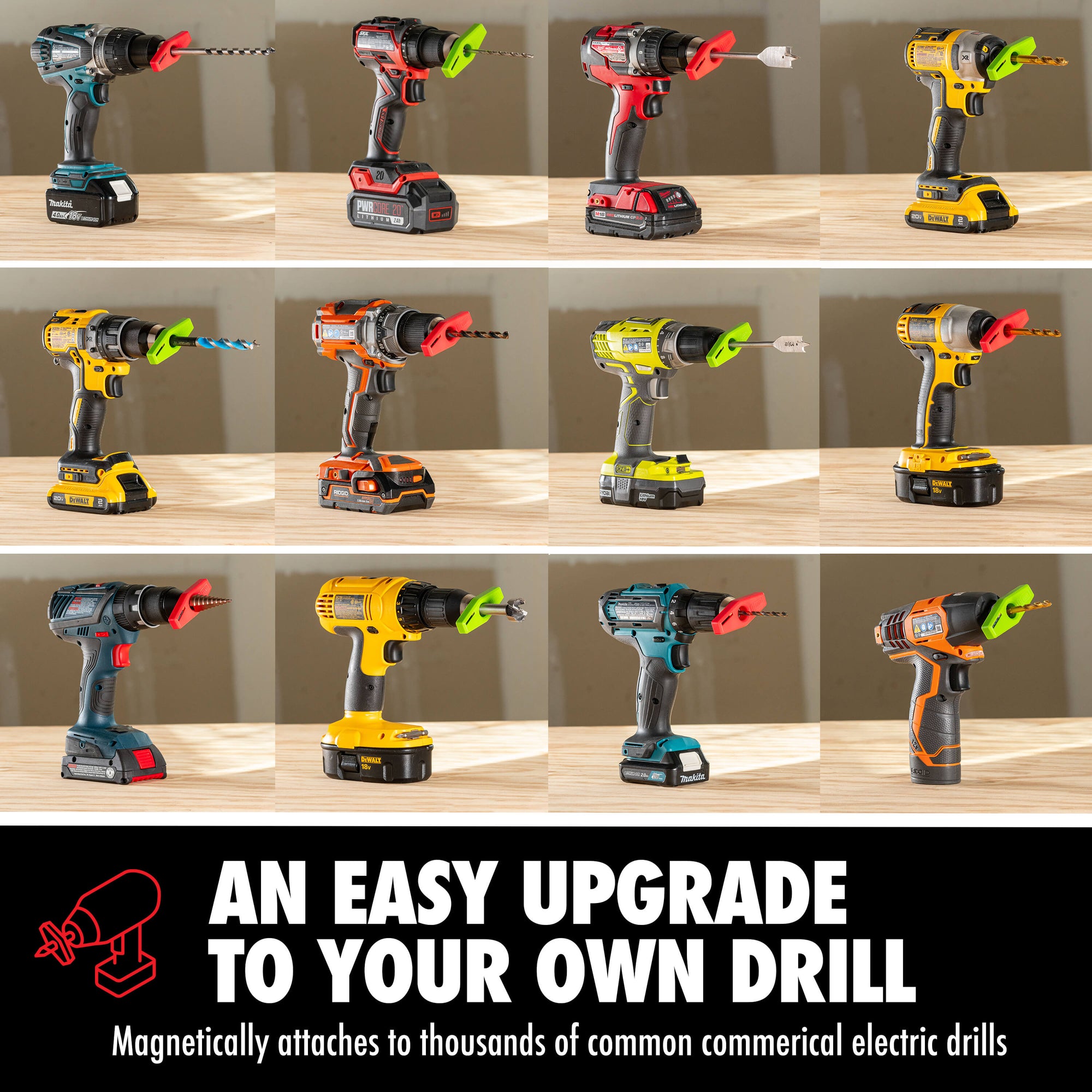 | Standard Electric Drill with a Keyed or Keyless Drill Chuck | Generally compatible (1*) under the following conditions: 1) Drill chuck has a round, metallic, flat face of greater than or equal to 0.65" diameter. 2) Drill chuck has a bit hole of less than or equal to 0.56" diameter. 3) Depending on the chuck face dimensions and size, an optional Standard Chuck Guide may be required to prevent displacement on the chuck face or detachment during rotation. 4) Maximum drill RPM is equal to or less than 2500 RPM. | Generally compatible (1*) under the following conditions: 1) Drill chuck has a round, metallic, flat face of less than 1.10" and greater than 0.70". 2) Maximum drill RPM is equal to or less than 2500 RPM. 3) Use only a Standard Chuck Guide with a center hole diameter that is slightly larger than the round, metallic flat chuck face. | Generally compatible (1*) under the following conditions: 1) Drill chuck has a round, metallic, flat face of greater than or equal to 0.65" diameter. 2) Drill chuck has a bit hole of less than or equal to 0.56" diameter and larger than or equal to 0.414". 3) Maximum drill RPM is equal to or less than 2500 RPM. |