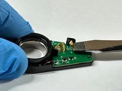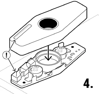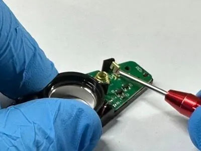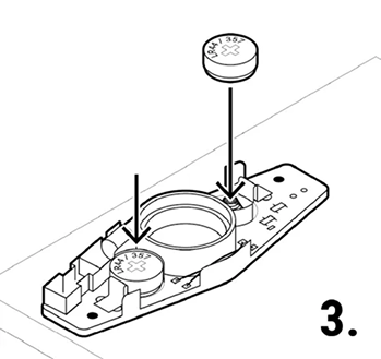 Carefully insert two new LR44 or 357 coin cell batteries into the two battery slots. The negative side of the battery (which is the curved cap) should be oriented so it is facing down when inserted into the battery slots against the battery coils on the printed circuit board.