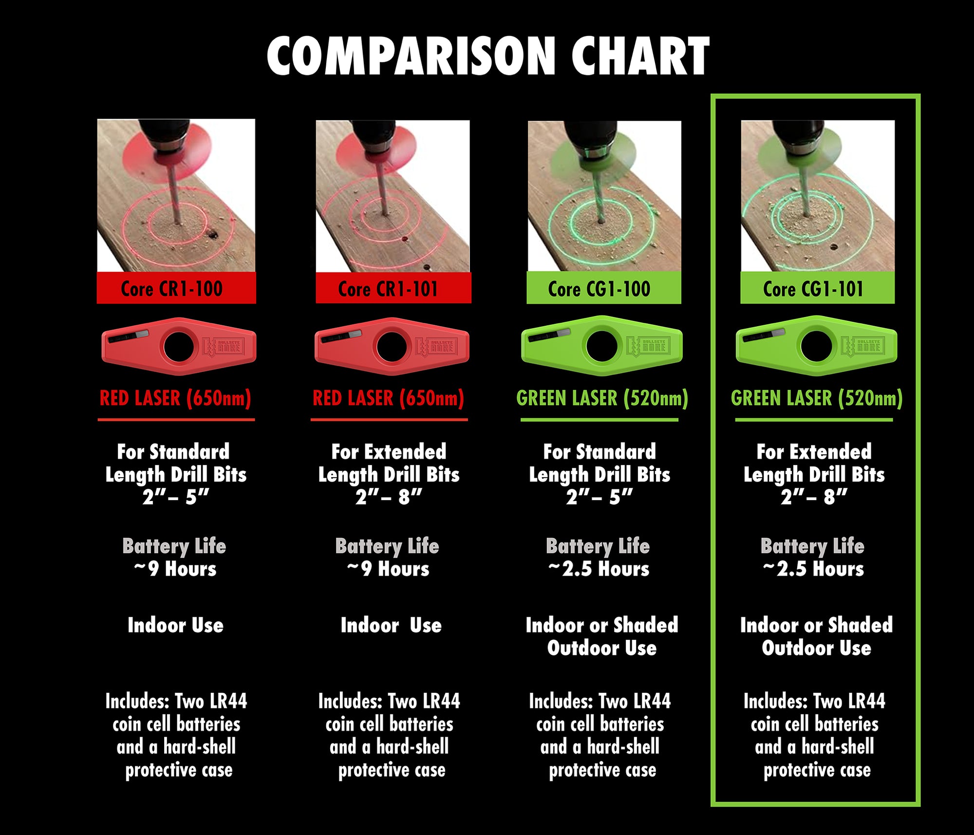 CG1-101 MODEL DESCRIPTION | BullseyeBore Core Green Extended Distance |