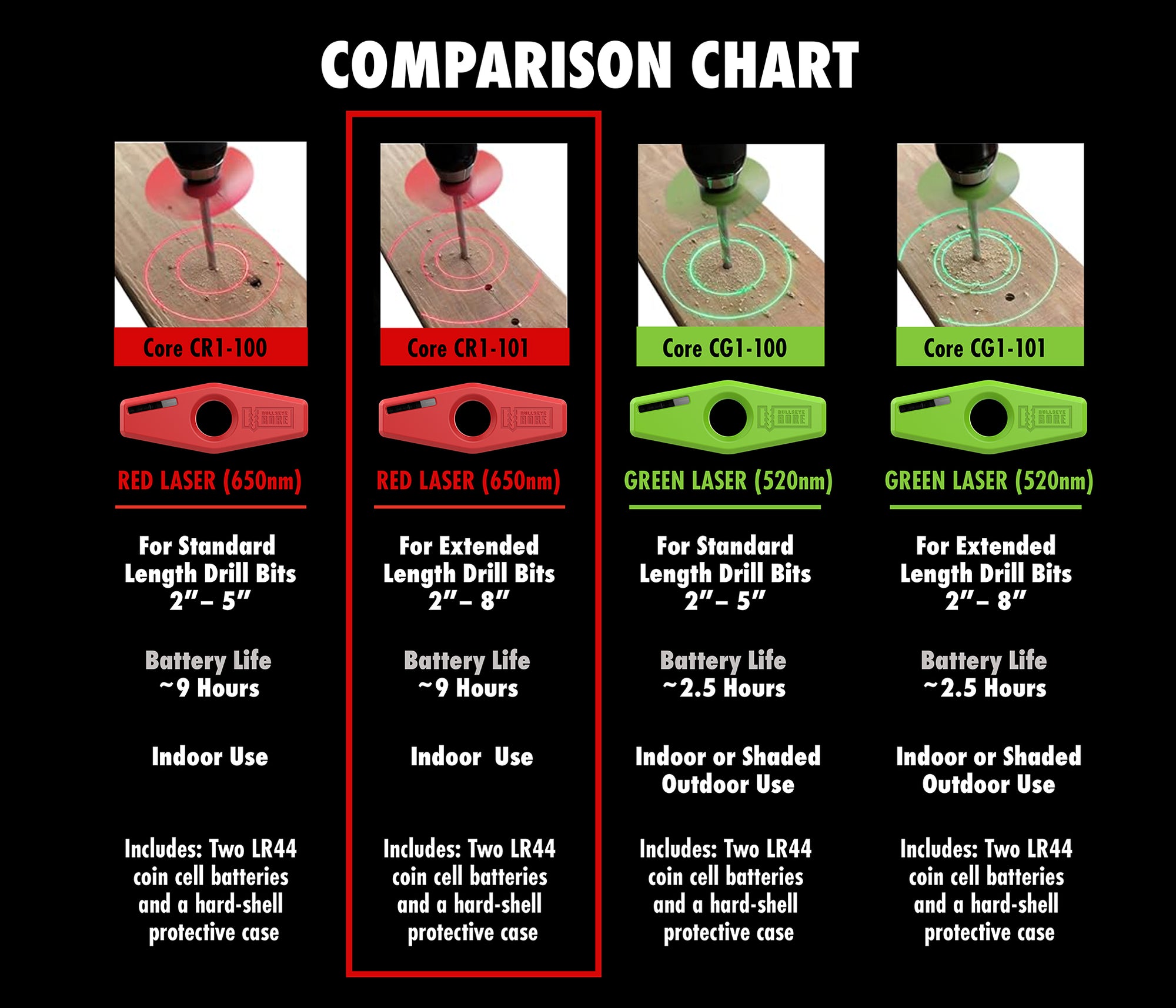 • EXTENDED BATTERY LIFE RED LASER TECHNOLOGY: Features long-lasting 650nm red laser with one fixed Reference Pattern and two variable Alignment Patterns, providing significantly longer battery life than green laser models. Perfect for extended indoor use and applications where frequent battery changes are impractical. Supports drill bits from 2" to 8" including specialty bits (Spade, Auger, Forstner, Step, and Aircraft bits).